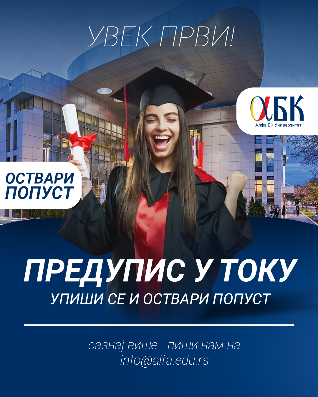 Upis za školsku 2025/2026. godinu je u toku. Za više informacija o programima i uslovima upisa, posetite zvaničnu stranicu i društvene mreže Alfa BK Univerziteta, a za sva pitanja možete pisati na info@alfa.edu.rs